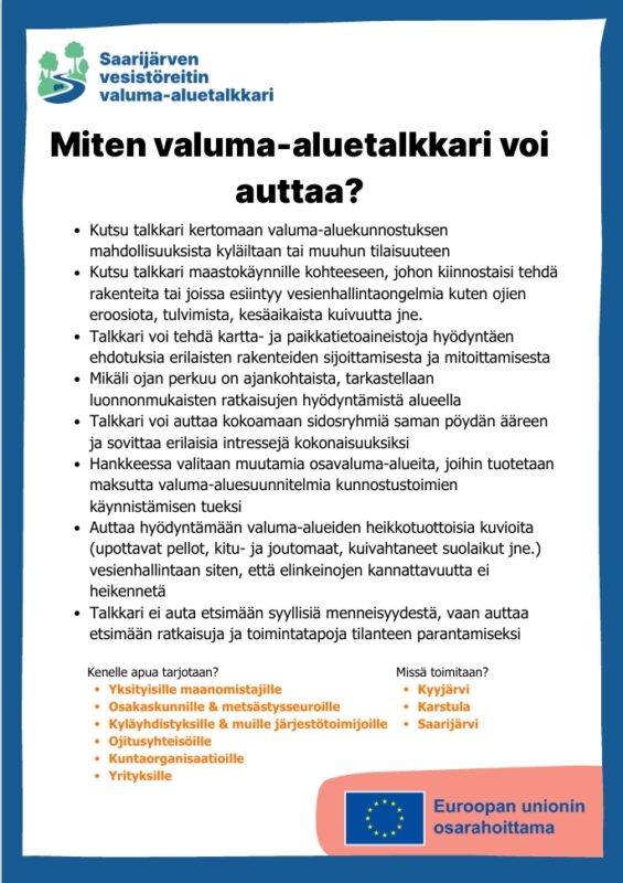 Saarijärven vesistöreitin valuma-aluetalkkari -hanke käynnistää valuma-aluesuunnittelun mukaisia toimia Kyyjärven, Karstulan ja Saarijärven alueilla. Talkkarin tehtävänä on: